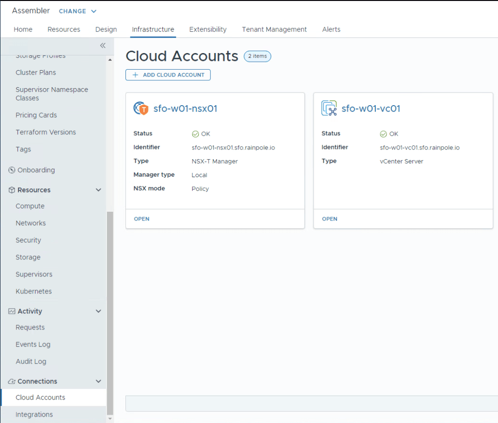 Click the Infrastructure tab. We can see here that both the vCenter and NSX manager have already been added using the service accounts provided in the Planning and Preparation workbook. Both the vCenter and NSX manager have also been associated with each other so they work in tandem.