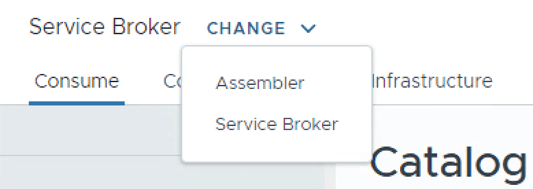 Either click the 9 squares in a grid in the top right corner, and select Assembler. Or to quicker switch between Assembler and Service broker, select the Change dropdown under your organisation name, to jump between them.