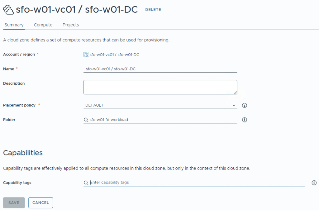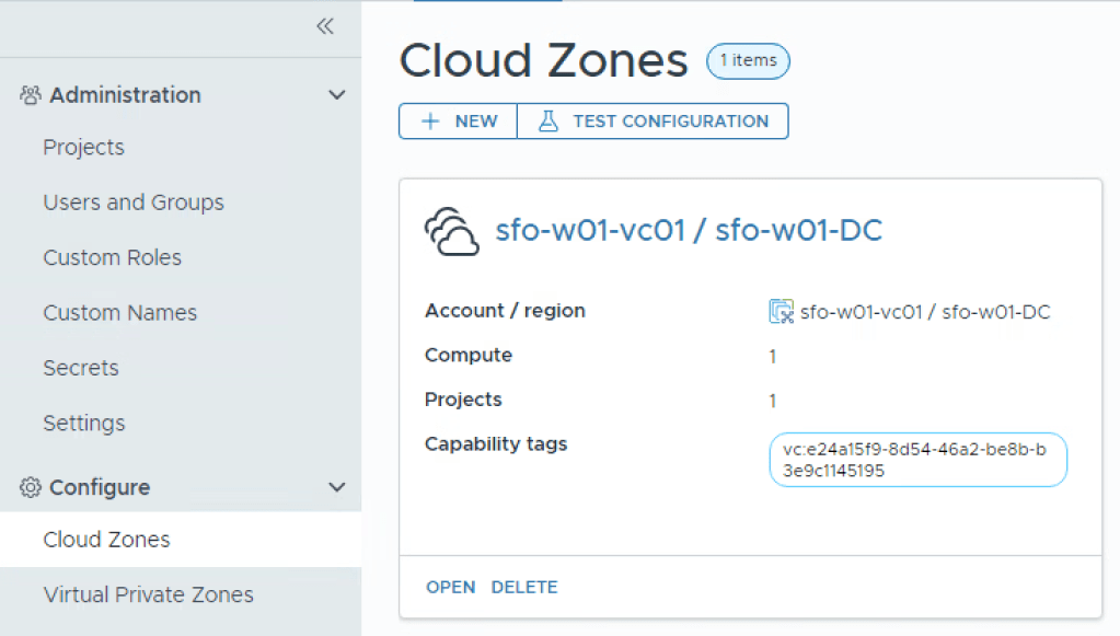 Head up to the Configuration section, and select Cloud Zones for the last vital thing to see that’s already been configured. Here we can see that the Workload Domain has already been configured, ready to have things provisioned to it.