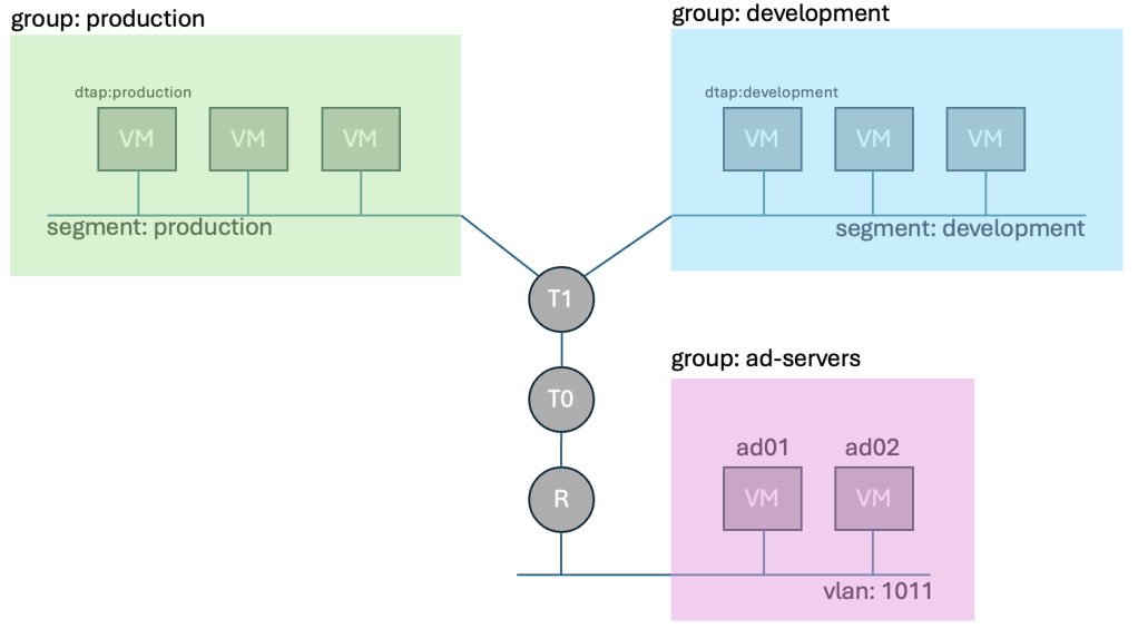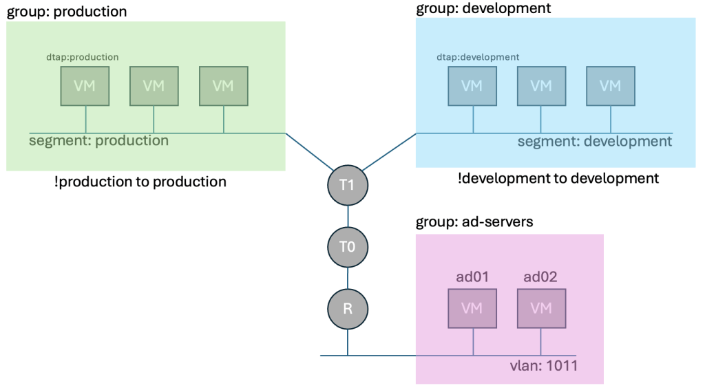 VCF Automation has applied the security tag dtap:production, and dtap:development to the three VMs on each segment. The tag alone has no enforcement, and does nothing.