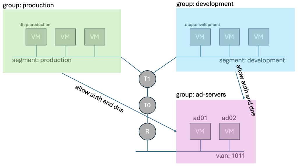 We have now allowed VMs that belong to production or development to talk to the two ad-servers using authentication protocols, and dns.