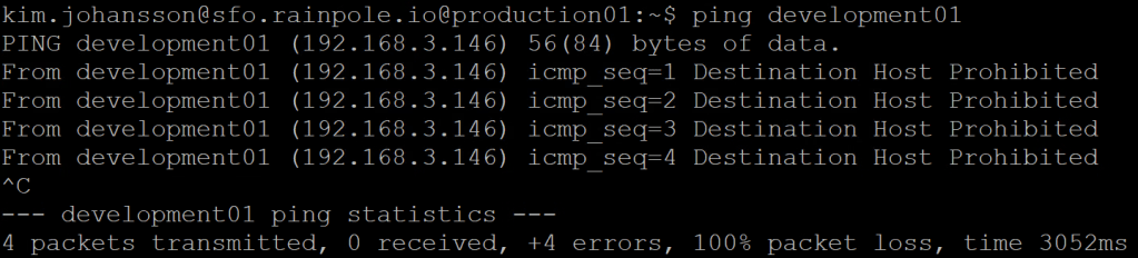 If i now login to one of the three production VMs, and try to ping the development VM, you will see that it is Prohibited, since we selected Reject as the Action.