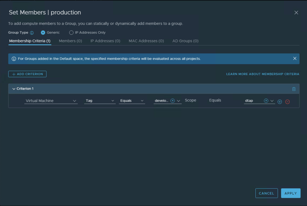 We then created two dynamic groups, where we stated that the group has a membership criteria that includes all VMs (current, and future) that have the security tag dtap:production, or dtap:development. We also created a more “static” group called ad-servers with two static ip entries since they are not within control of NSX.