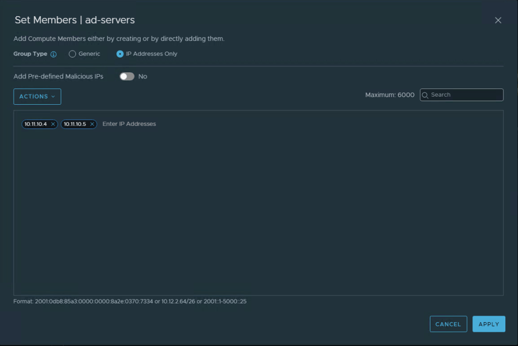 Finally, we want to add a group for our Active Directory as an example of a common service. In my environment, my ADs are not inside the virtual environment, i will thus add them as IP-Addresses instead. If your ADs are virtual, and within a vCenter connected to NSX i highly recomment adding them to the group as Objects, of either a Virtual Machine Tag, or Name.