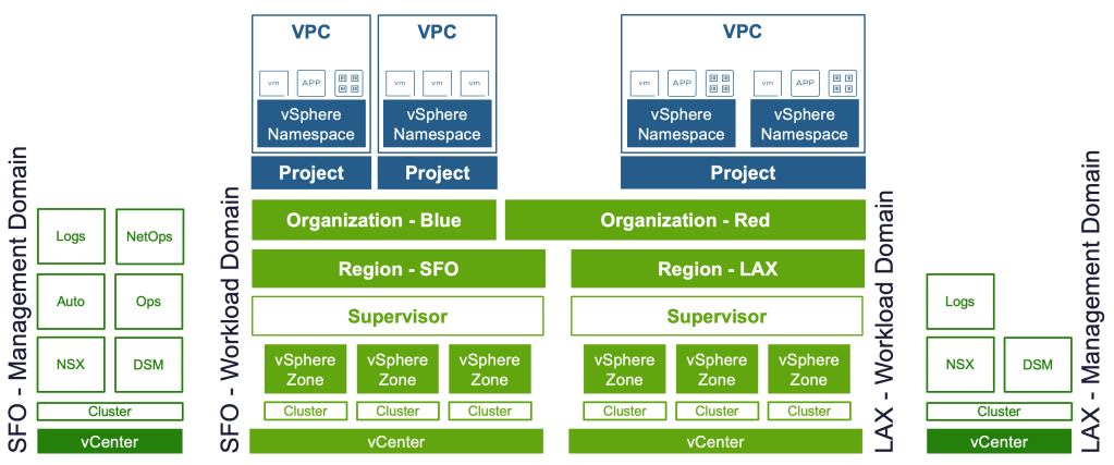 It’s a single Fleet, with two Instances. What this means is that each Instance is a Management Domain, and a Workload Domain, but they are both managed by the same Fleet appliances (Operations, Automation). Some appliances are local to each of the Instances (vCenter, NSX Managers, NSX Edge Clusters, Operations for Logs, etc. Some appliances (Operations, Automation) can in the event of a disaster, or planned outage be failed over from SFO, to LAX.