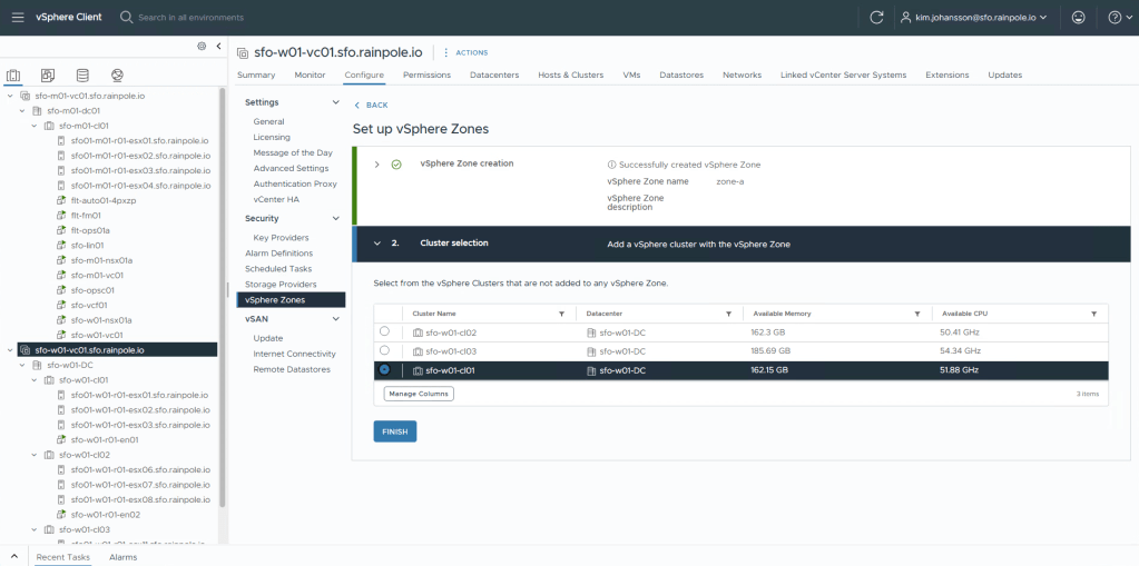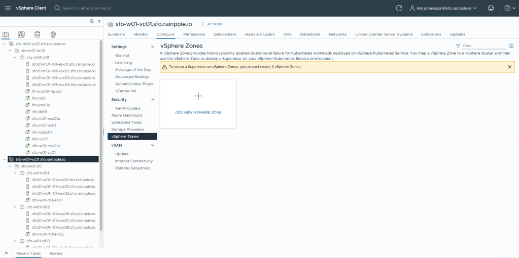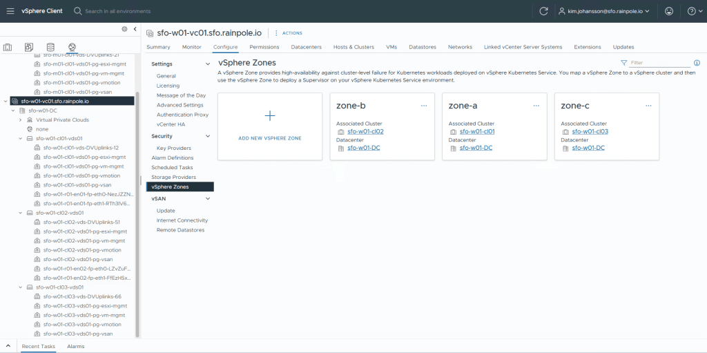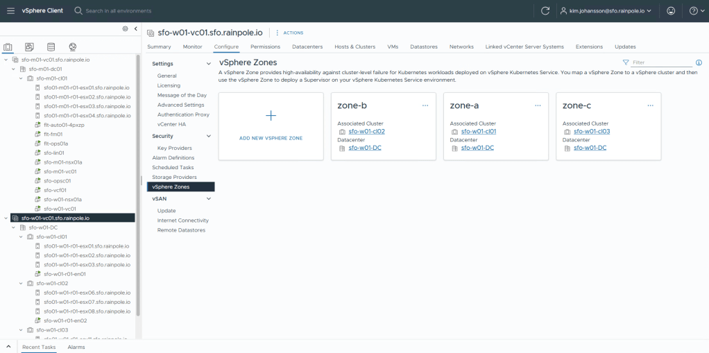 Navigate to the vCenter object for your workload domain, Configure menu, vSphere Zones.