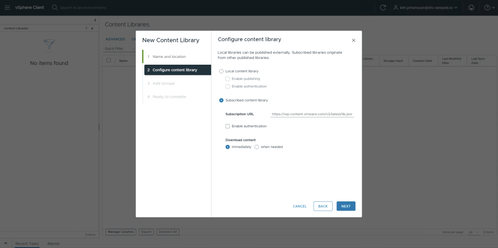 Select Subscribed Content Library, and enter https://wp-content.vmware.com/v2/latest/lib.json