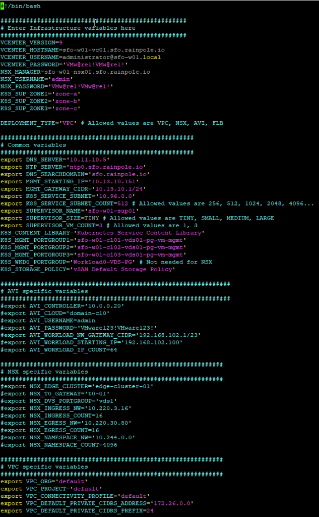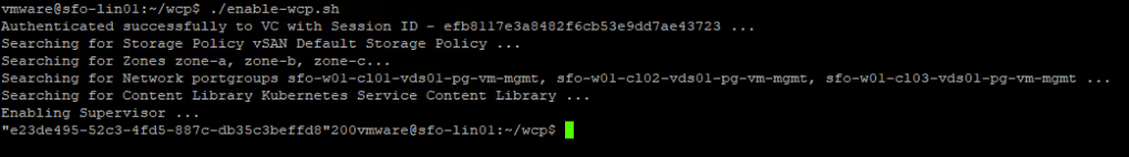 His script has support for multiple different network backings, but we need to use VPC for VCF-A. So grab the enable_on_zone_vpc.json and enable-wcp.sh files and put on a suitable linux machine.