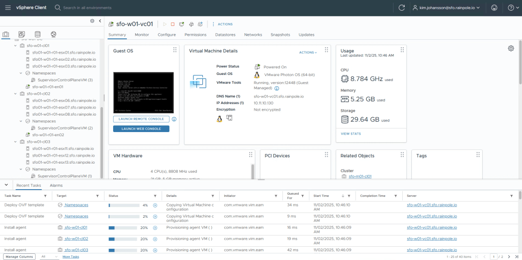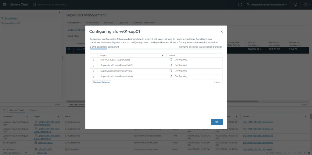 If you switch to the vSphere Client, you will now see there’s a Namespace, and a Supervisor node created in each of your 3 clusters. After about 5 minutes, it should be done deploying, however it will take a bit longer for all the kubernetes services to get up and running.
