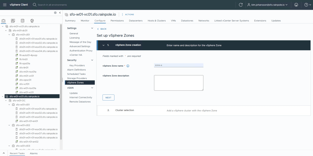 Now click Add new vSphere Zone, and create 3 Zones. Start by defining the name.