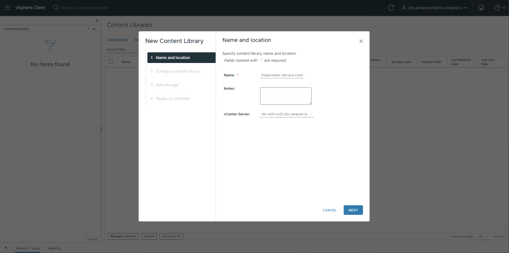 Click vSphere Client, Content Library, Create, now enter Kubernetes Service Content Library for the name, and select your Workload Domain vCenter server where you are enabling the Supervisor Service. Click Next.