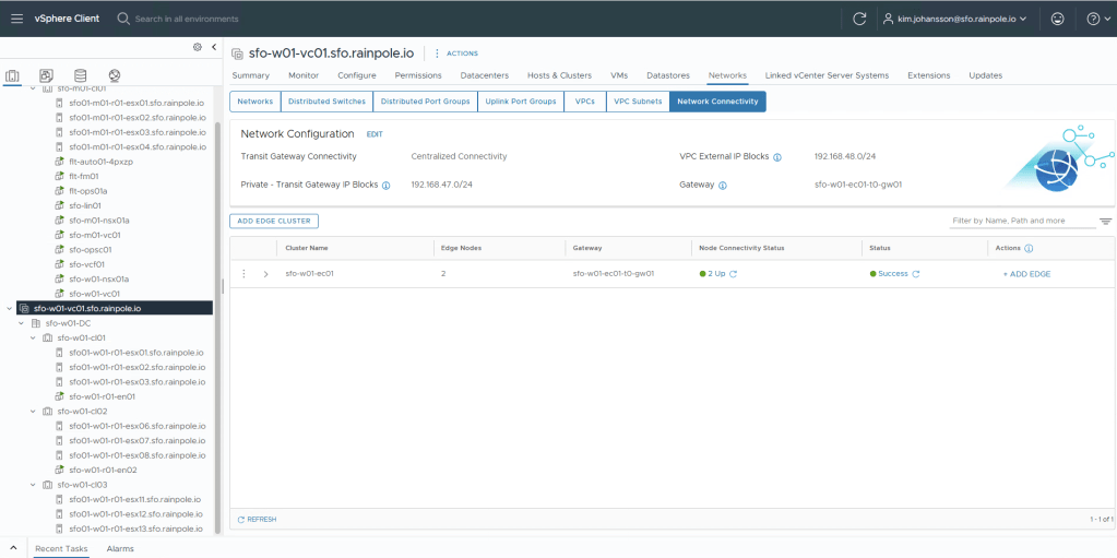 To recap, at this point i’ve created 3 clusters in a Workload Domain, and also deployed a NSX Edge-Cluster that spans two of the Clusters to gain high availability on network ingress/egress.