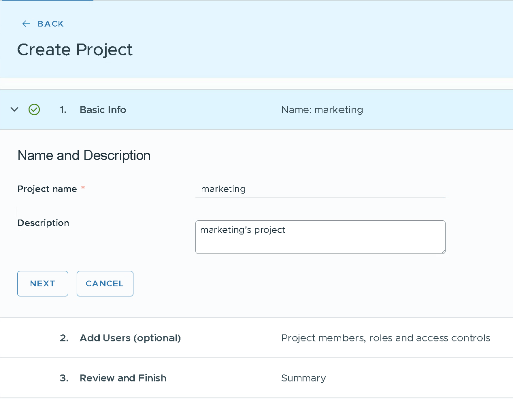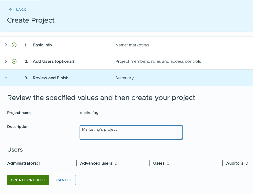 Let’s create a project for Marketing, and then a vSphere Namespace for them.