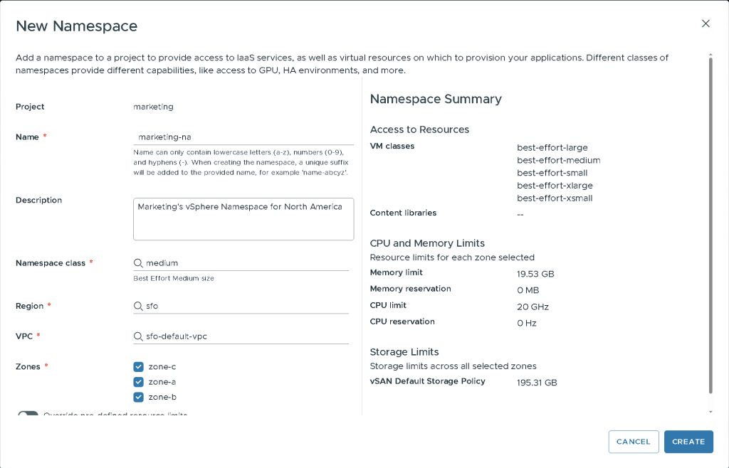We’re going to create a vSphere Namespace for North American, in Name input marketing-na. We need to provide a unique name that follows kubernetes naming standard, select a Namespace Class, the region to carve resources from, what VPC to attach to, and what zones be ablet o create resources from.